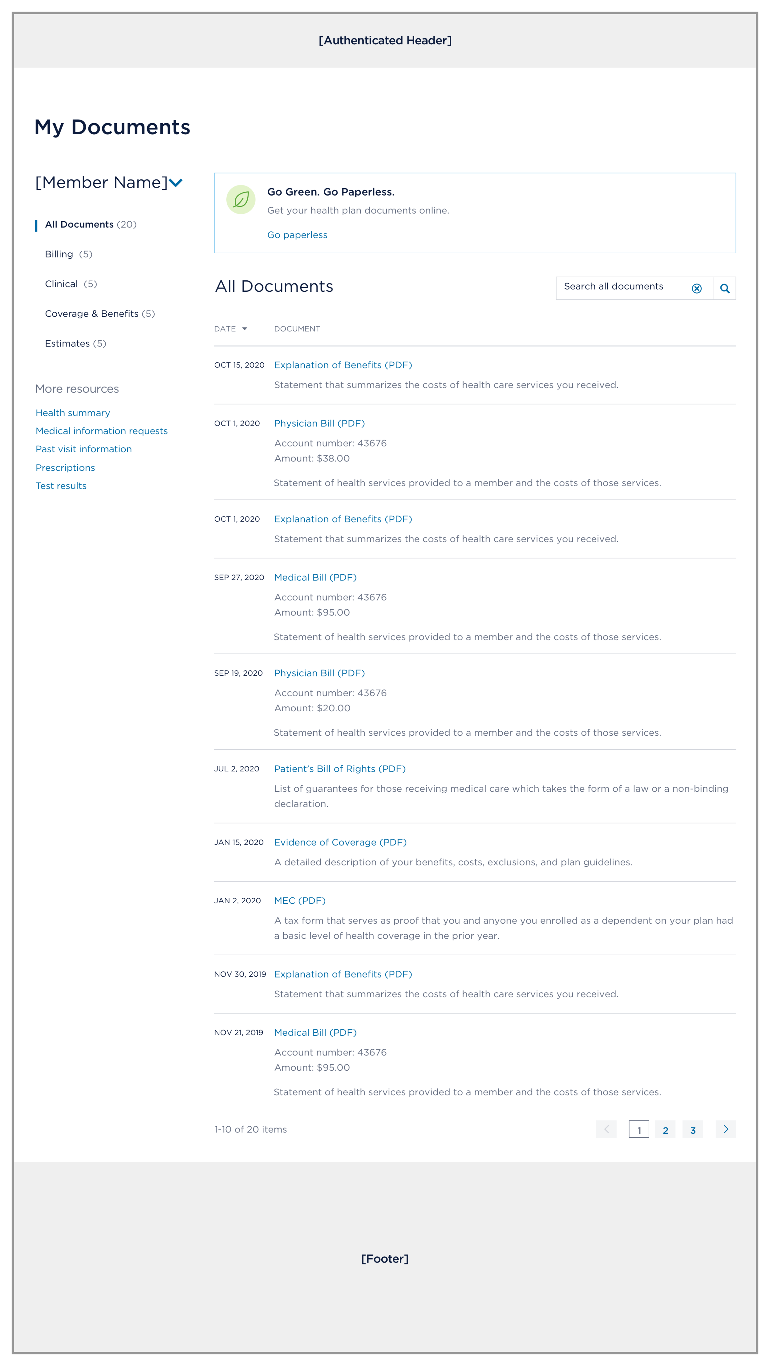 The My Documents page, which is intended to be a centralized hub of all health insurance documents for the member, offered another opportunity for us to improve within the scope of this project by applying our experience fragment. I looked closely at the current experience, and noted potential user pain points: