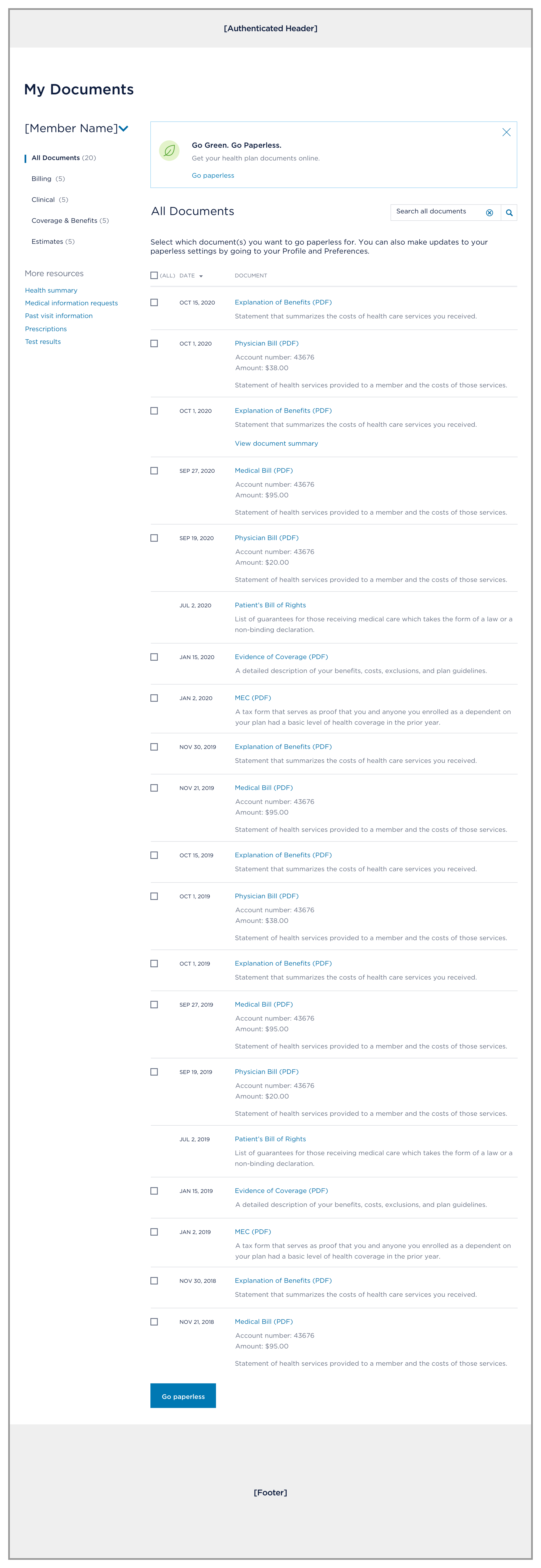 Working in the digital design department of a major health insurance provider, I was assigned to focus on the Global Paperless Initiative, a large-scale effort to increase member awareness of and commitment to paperless options. The initiative is broken down into several separate (but related) projects, each with its own timeline and goals. I worked as the lead UX Designer on several paperless projects: