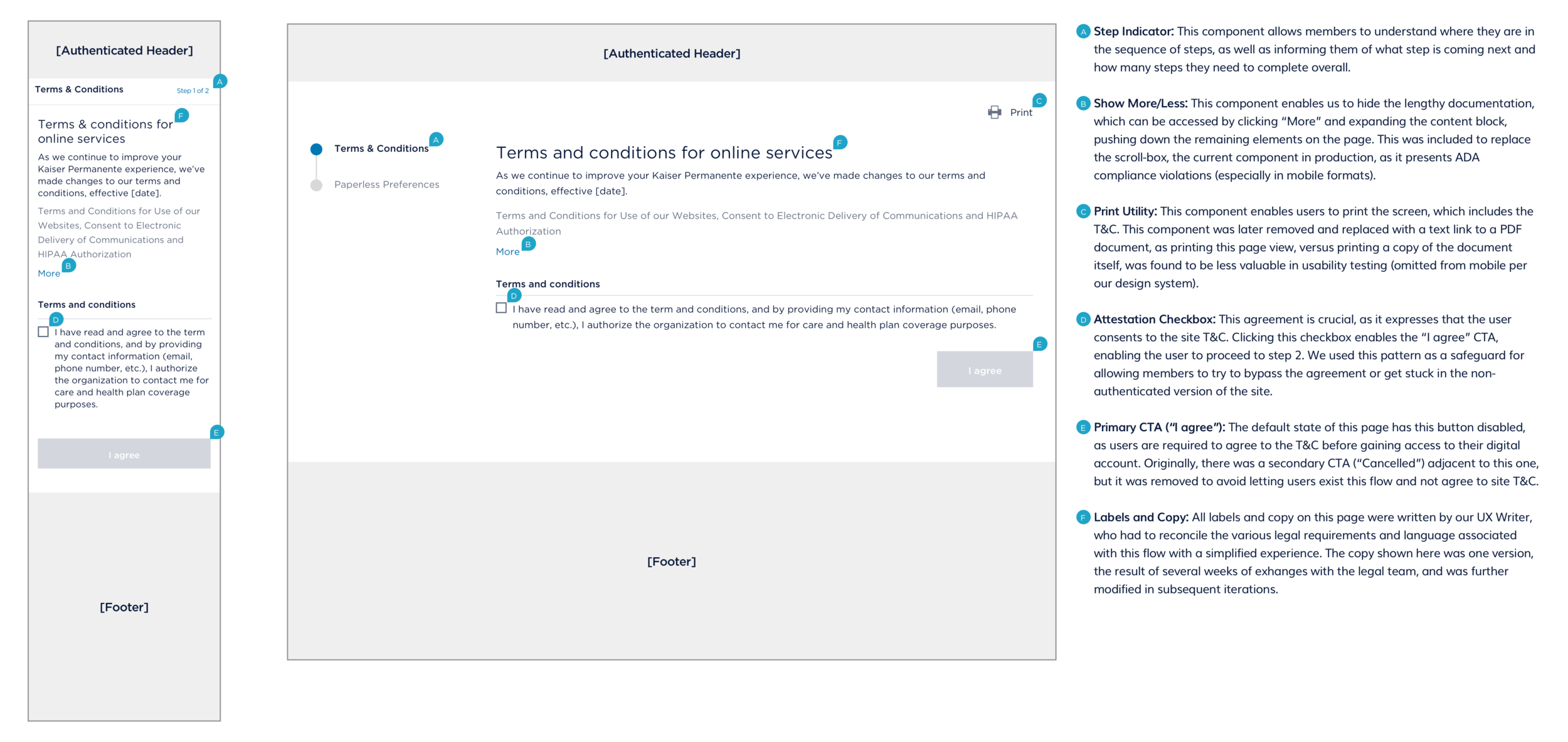 The placement at the bottom would necessitate the user to read far enough to find the “I agree” CTA, so my hypothesis was that members were more likely to agree after having gotten that far, which I later validated in user testing. Other key findings were: