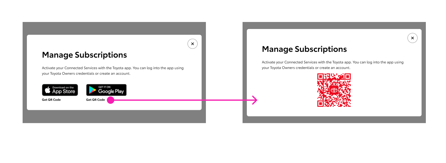 As users can only manage subscriptions via the app, including AppStore and GooglePlay links on desktop breakpoints is not particularly useful. I designed a QR Code generator that a user could scan to their mobile device to open and access the appropriate page to rectify this potential pain point.