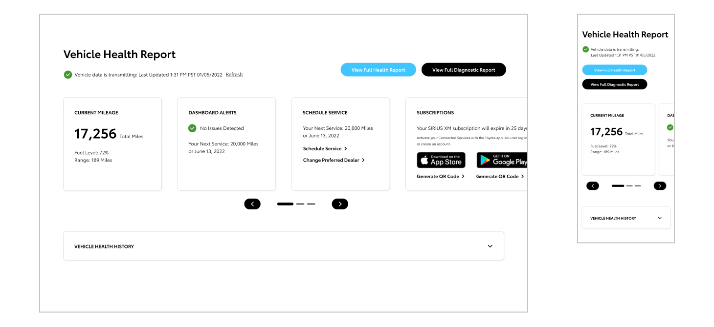 The intent is that customers will extend their relationship with the brand beyond the purchase of just one vehicle. The initiative includes redesigns of all pages, new global navigation, and migration of the codebase to a single environment. My team was tasked with the design and launch of a new Owner’s Vehicle Dashboard (“Dashboard”, for short) while considering its place and function within the unified ecosystem, along with the marketing and purchasing platforms.