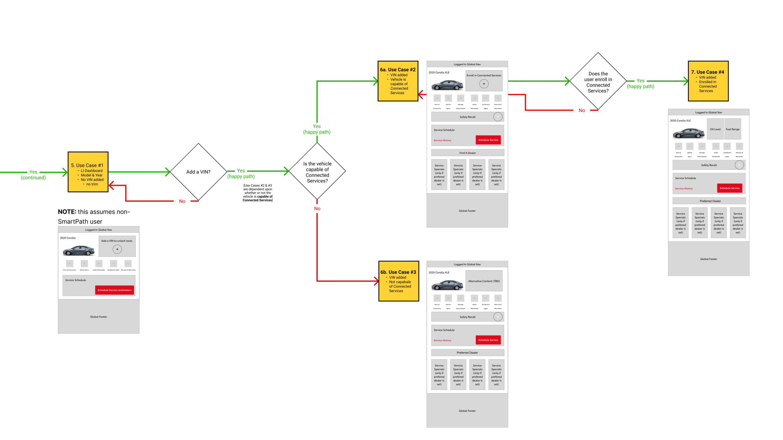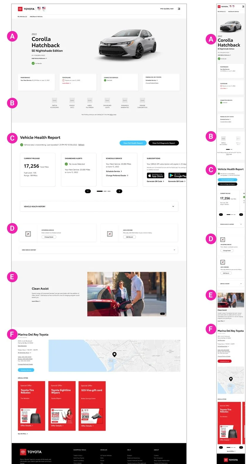 This is an example of the full page layout exemplifying how the Dashboard appears for a VIN-entered > enrolled in Connected Services use case. All other use cases are variations of this, with each component molding itself to the designated need. By approaching the page in this fashion I met the deadline established by our dev partners with time to spare and could make revisions to components prior to dev hand-off while better capturing post-MVP goals and user research opportunities for upcoming sprints.